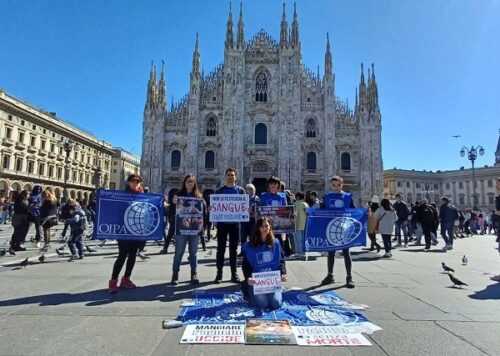 Stamattina i volontari dell’Organizzazione internazionale protezione animali (Oipa) hanno tenuto un sit-in a Milano, in piazza del Duomo, contro la strage degli agnelli in vista della prossima Pasqua.