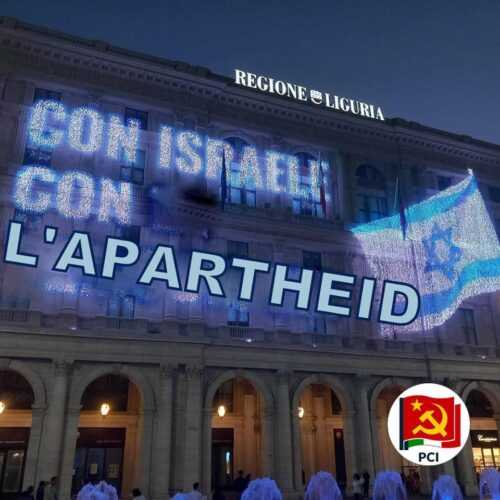 Questo accade anche nel nostro Paese dove sempre più persone guardano con favore al ritorno ed alla crescita del Partito Comunista Italiano che mai si piegherà alla falsa propaganda come quella utilizzata in maniera vergognosa nella nostra regione da Toti che con un’immagine proiettata sul palazzo della regione Liguria definisce democratico uno “Stato” tiranno e sanguinario come quello di Israele che, da Comunisti, non smetteremo mai di denunciare.