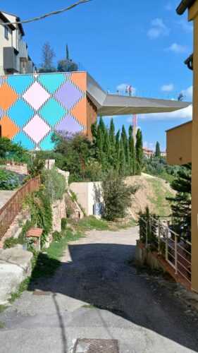 GHIZZANO – E poi c’è Ghizzano … Se Peccioli è VISION e PROGETTUALITA’, Ghizzano è L’IDEA. Stiamo parlando di una frazione di Peccioli con forse 500 abitanti. David Tremlett è un’artista inglese che aveva già eseguito degli interventi di colore ai grandi muri di contenimento della discarica di Legoli. David stava passeggiando con qualche personaggio del comune di Peccioli (forse il sindaco?) perché c’era la voglia di “fare qualcosa anche qui”. E David, come in tutte le belle storie, partorisce l’idea: riempire di colore la “Via senza Tempo”, stradina d’accesso al borgo diritta ed anonima.