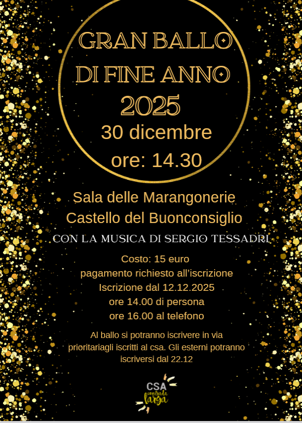 Un pomeriggio all’insegna della festa e della socialità per gli anziani della città è in programma martedì 30 dicembre al Castello del Buonconsiglio dove torna l’apprezzatissimo Gran ballo di fine anno. L’appuntamento è a partire dalle 14.30 nella suggestiva Sala delle Marangonerie dove gli ospiti saranno accolti in un’atmosfera elegante e vivace, accompagnati da un ricco programma di danze e dalla musica dal vivo di Sergio Tessadri. Alle ore 16 è previsto un momento conviviale con rinfresco e il tradizionale brindisi, per salutare la fine del 2025 e dare il benvenuto al nuovo anno.