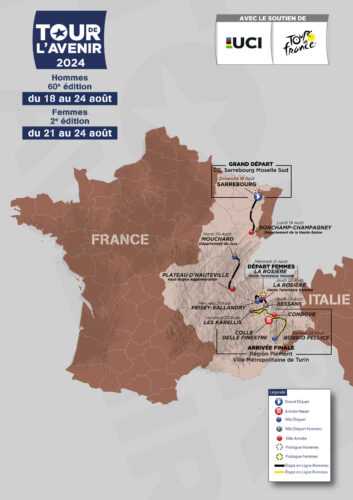 Il giorno successivo, sabato 24 agosto, l’ultima tappa partirà da Bobbio Pellice e si concluderà ai 2176 metri del Colle delle Finestre, dopo 18 chilometri di salita, di cui gli ultimi 7,8 su strada sterrata. Il percorso delle due tappe piemontesi è comune al Tour de l’Avenir maschile e femminile. Quella del 2024 sarà un’edizione del Tour de l’Avenir all’insegna della montagna, poiché il prologo di Sarrebourg, nel Dipartimento della Mosella, sarà seguito dalla traversata del massiccio dei Vosgi, del Giura e dell’Altopiano di Hauteville nel Dipartimento dell’Ain, prima di raggiungere la Savoia e passare sul versante piemontese delle Alpi.