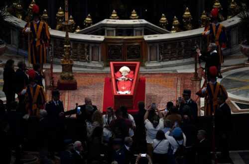 Il feretro viene deposto su una piccola pedana rossa leggermente inclinata, sopra un tappeto a terra. Nessun catafalco, come sempre avvenuto nel passato, secondo la volontà di Francesco. Il corpo del Papa defunto viene asperso con l’acqua benedetta e incensato. Si proclama il Vangelo, l’assemblea è disposta in semicerchio e segue il canto dei salmi e delle litanie. L’atmosfera continua a mantenere un tono di forte intimità; le prime file di cardinali e vescovi che vanno a dare il loro saluto al Pontefice sono ordinate. Lui è lì, sopra la tomba dell’apostolo, con un’espressione serena che somiglia a un vago sorriso come i tanti che ha dispensato nelle sue uscite pubbliche.