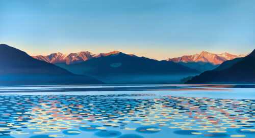 L’impagabile vista sul lago ha ispirato così le vedute in mostra. Come un diario visivo, i dipinti raccontano le variazioni potenzialmente infinite di uno stesso paesaggio, in cui monti, acqua, cielo e luce sono attraversati dal ritmo naturale delle stagioni e del trascorrere del giorno. Sono quindi opere omaggio alla bellezza e alla semplicità del paesaggio quelle della serie “Lago Maggiore” che segna un nuovo, importante tassello nella ricerca dell’artista: pur mantenendo i colori vivaci e le forme ben definite tipiche della sua produzione, i grandi oli su tela esposti al MASI rompono, infatti, con il suo mondo pittorico precedente.