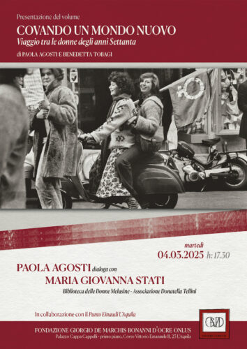 Martedì 4 marzo 2025 alle ore 17.30, la Fondazione Giorgio de Marchis Bonanni d’Ocre è lieta di ospitare la presentazione del volume Covando un mondo nuovo – Viaggio tra le donne degli anni Settanta di Paola Agosti e Benedetta Tobagi per Einaudi Editore.