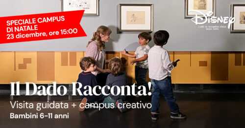 Aspettando il Natale, lunedì 23 dicembre alle ore 15.00 tutti i bambini dai 6 agli 11 anni potranno partecipare allo speciale campus “Il Dado Racconta! Scopri la Magia dell’Animazione con Disney”, una visita guidata animata alla mostra con un’attività didattica creativa che trasporterà i giovani visitatori in un viaggio nell’arte della narrazione e dell’animazione. Partendo dalla realizzazione di un dado speciale con protagonista, antagonista e poteri magici, si darà vita a una fiaba collettiva, sviluppando insieme una vera e propria storia.