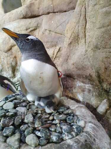 Il piccolo è visibile dal pubblico nel suo nido, all’interno della vasca dei pinguini, tra le zampe dei genitori che si alternano ad accudirlo. Per poterlo nutrire, mamma e papà mangiano una quantità di cibo 2-3 volte maggiore rispetto alla dieta normale.