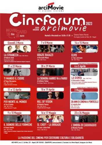 L’inaugurazione dell’edizione 2023 vedrà in sala Roberto Andò che presenta “La stranezza”, film ambientato nella Sicilia degli anni Venti del secolo scorso che vede protagonisti Toni Servillo, Renato Carpentieri, Ficarra & Picone e Luigi Lo Cascio. Nel corso della serata – con proiezioni alle ore 18 e alle 21 ad ingresso gratuito – sarà possibile acquistare la tessera Arci Movie 2023 che prevede al costo di 20 euro la visione di dieci film, la tessera nazionale Arci, il prestito gratuito degli oltre settemila film della Mediateca Il Monello e l’ingresso a tutti gli eventi dell’associazione. La rassegna del Cineforum proseguirà poi ogni settimana con quattro proiezioni, il martedì e il mercoledì, sempre alle ore 18 e alle ore 21, nella sala principale di cinquecento posti del Cinema Pierrot in via Angelo Camillo de Meis 58 a Ponticelli. È possibile accedere in sala anche acquistando un singolo biglietto al costo di 5 euro.