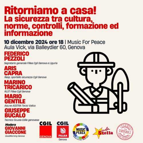 Genova – Martedì 10 dicembre alle ore 18 presso l’Aula Vick del Music For Peace di Via Balleydier 60 a Genova si terrà l’incontro organizzato da Camera del Lavoro di Genova e Fillea Cgil dal titolo “Ritorniamo a casa! La sicurezza tra cultura, norme, controlli, formazione ed informazione”