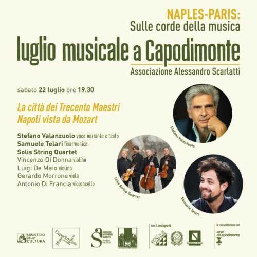 La rassegna Luglio musicale 2023, finanziata con fondi POC della Regione Campania e organizzata dall’Associazione Scarlatti, sotto la direzione artistica di Tommaso Rossi, entra nel vivo con due concerti: uno sabato 22 luglio alle ore 19.30 “La città dei Trecento Maestri. Napoli vista da Mozart” con testo e voce narrante di Stefano Valanzuolo, Samuele Telari alla fisarmonica, Solis String Quartet, Vincenzo Di Donna e Luigi De Maio al violino, Gerardo Morrone alla viola e Antonio Di Francia al violoncello e domenica 23 luglio ore 19.30 con il pianista Ciro Longobardi.