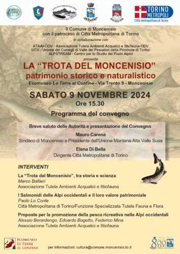 La trota del Moncenisio, patrimonio storico e naturalistico” è il tema di un convegno in programma sabato 9 novembre all’Ecomuseo “Le Terre al Confine” di via Trento 9 a Moncenisio. L’iniziativa dell’Associazione Tutela Ambienti Acquatici e Ittiofauna, dell’Unione dei Consigli di Valle dei Pescatori della Provincia di Torino e di AlpStream-Centro per lo Studio dei Fiumi Alpini, è patrocinata dalla Città metropolitana di Torino.