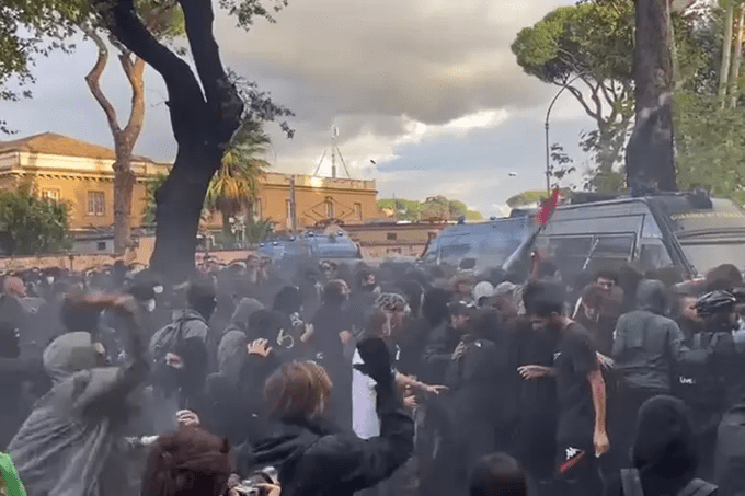 Lancio di bottiglie, fumogeni, esplosioni, da parte dei manifestanti che non accettano il divieto di corteo. Anche un palo della segnaletica stradale è stato lanciato contro le forze dell’ordine che presidiano la piazza. Il grosso dei manifestanti è arretrato. Autori del lancio di bombe carta, lacrimogeni e del palo un gruppo di incappucciati. La polizia ha risposto con lacrimogeni.