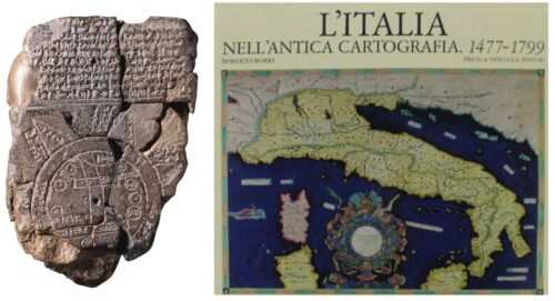 Nella foto: la Mappa Mundi Babilonese ed una antica Carta d’Italia (dal web)