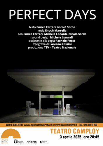 In scena insieme a Nicolò Sordo l’attore Enrico Ferrari e il musicista Michele Lonardi. È proprio nei bar che l’attore Enrico Ferrari (co-autore della pièce) ha trovato ispirazione per il suo personaggio, il grande villain protagonista di Perfect Days: “Questo spettacolo è stato scritto a Verona, per Verona. È lo specchio di quello che si può trovare in molti angoli della città. Per questo è importante che non solo le persone che frequentano il teatro possano vederlo.
