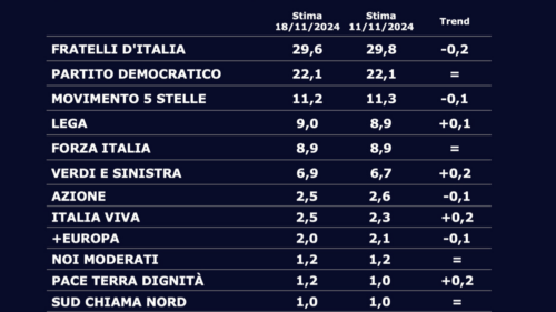 Secondo l’ultimo sondaggio SWG per La7, Fratelli d’Italia registra una lieve flessione dello 0,2%, scendendo sotto la soglia simbolica del 30% e attestandosi al 29,7%. Nonostante il calo, il partito di Giorgia Meloni mantiene saldamente la leadership tra le forze politiche italiane.