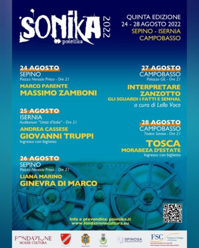 “Sonika Poietika rappresenta ormai una realtà consolidata – afferma Antonella Presutti, Presidente della Fondazione Molise Cultura – in grado di intercettare un pubblico variegato, di giovani e meno giovani. Negli ultimi anni, Sonika, guardando alla grande tradizione del cantautorato, ha dato spazio a quelle contaminazioni tra musica e parole, che rappresentano un connubio storicamente interessante e stimolante. L’Edizione del 2022 partirà dai risultati raggiunti e condivisi per ritornare nei luoghi artistici e storici del Molise, proponendosi con forza non solo come un importante palcoscenico musicale, ma anche come un’occasione e un’opportunità per scoprire e conoscere la nostra Regione.”