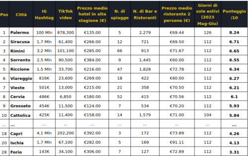 Palermo si classifica prima tra le migliori città estive in Italia con un punteggio di 8,24 su 10. La città eccelle su quasi tutti i fronti, con oltre 100 milioni di hashtag su Instagram e 878.300 video su TikTok, il numero più alto dello studio. Inoltre, Palermo ha uno dei prezzi medi degli alberghi più bassi tra le città analizzate, con 135,00€ a notte, il maggior numero di bar e ristoranti (2.279) e il numero più alto di giorni estivi soleggiati (126). Il prezzo medio nei ristoranti è il terzo più basso analizzato (69,44€), preceduto solo da Sorrento e Viareggio.