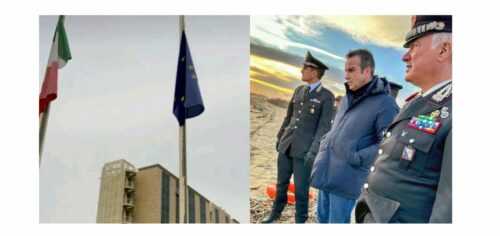 Bandiere a mezz’asta al palazzo della Regione Calabria in segno di lutto per la strage del peschereccio naufragato a poca distanza dalle coste ioniche del Crotonese a causa delle ostili condizioni atmosferiche dopo una traversata di quattro giorni e la partenza da Izmir in Turchia