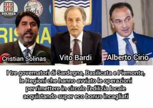 A fungere da apripista, si diceva prima, è stata la Provincia veneta di Treviso, seguita dalla Regione autonoma a statuto speciale della Sardegna e quindi dalla Regione lucana della Basilicata, alla quale si è più di recente aggiunta la Giunta regionale del Piemonte che, con il proprio governatore Alberto Cirio, ha stimato di poter acquistare titoli da super eco bonus fino a un massimo di 50 milioni annui, alle condizioni secondo cui tali crediti non siano oggetto di contenzioso e facciano riferimento a interventi edilizi azionati nei rispettivi territori.