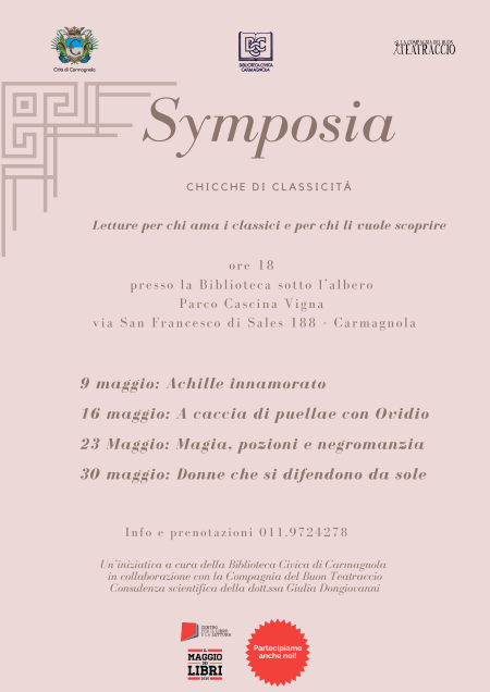 In occasione del “Maggio dei Libri”, la campagna nazionale del CEPELL per la promozione della lettura, il Comune di Carmagnola – attraverso la Biblioteca Civica Rayneri-Berti – propone una nuova rassegna letteraria dal sapore antico: “Symposia: chicche di classicità”, in collaborazione con la Compagnia del Buon Teatraccio e con la consulenza scientifica della dott.ssa Giulia Dongiovanni.