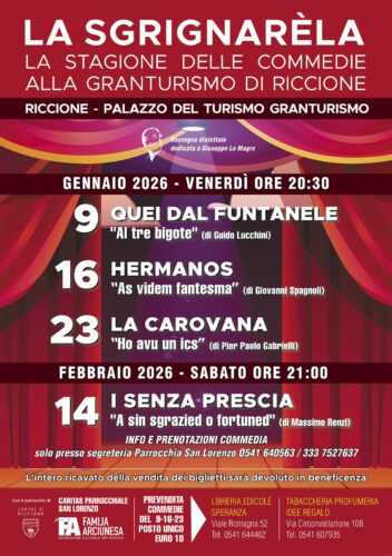 Riccione – Il dialetto torna protagonista della scena riccionese. L’associazione culturale Famija Arciunesa annuncia il ritorno de “La Sgrignarèla”, la rassegna teatrale che trasforma il divertimento in un gesto concreto di aiuto. Giunta alla sua terza edizione, l’iniziativa rinnova la fortunata tradizione delle commedie a scopo benefico, consolidando un legame profondo tra le radici locali, il piacere di stare insieme e la solidarietà, con il patrocinio del Comune di Riccione.