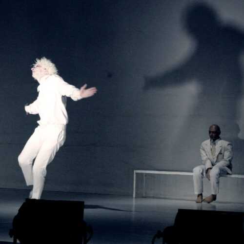 È una carriera fuori dall’ordinario quella di Manfredini, artista a tutto tondo per il mirabile uso dei mezzi espressivi e per la poetica riflessione sulla marginalità e la diversità, che rappresenta il fil rouge del suo percorso artistico. “Al Presente” è uno spaccato della mente e della sua inafferrabilità. In scena un uomo e il suo doppio: una parte è immobile, assorta, riflessiva, una parte è inquieta e si identifica con i fantasmi che popolano la sua mente. Entra attraverso l’immaginazione in un flusso di associazioni inarrestabili che lo conducono in diversi spazi, in diversi tempi della sua vita. Prende a prestito dalle patologie psichiatriche gli atteggiamenti fisici che esprimono tensioni, le amplifica attraverso quelle forme, porta alla luce le pulsioni più nascoste, cerca di dare ordine, forma, al caos della sua mente.