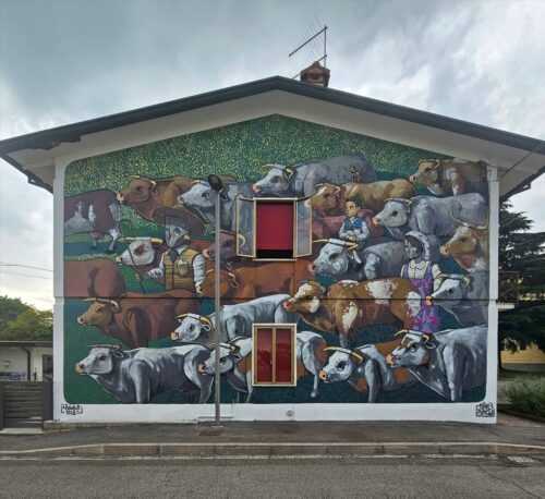 Si è concluso anche il cantiere di Pixel Pancho, artista torinese, classe 1984. “Nel murale “La dolce vita” l’artista sottolinea il rapporto tra uomo-animale e natura; tre robottini, che incarnano simbolicamente la famiglia, guidano una mandria, chiaro riferimento al conformismo della società contemporanea, all’omologazione, alla massa che si sposta a seconda di chi la guida”, scrive Antonella Alban, la critica d’arte che ha seguito il progetto.