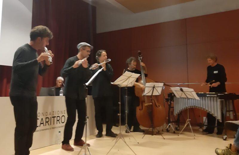 Penultimo appuntamento della lunga stagione del TrentinoInJazz 2019, giovedì 5 dicembre al Circolo Paganini di Rovereto (TN) con il Til Cage Flute Quintet, protagonista di una nuova serata della sezione TrentinoIn Jazz Club, programma ideato da Emilio Galante per coinvolgere i club di Trento e Rovereto. Tre flauti (Giulio Visibelli, Carlo Nicita, Emilio Galante), insieme al vibrafono di Luca Gusella e al contrabbasso di Tito Mangialaio per un concerto speciale dedicato al flautista Til Cage, scomparso a Rovereto.