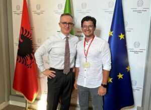 Sempre nel mese di settembre appena trascorso, sua eccellenza Fabrizio Bucci ha ricevuto l’alunno Klaudio Pinderi, già studente con profitto della sezione bilingue nella contea di Korca presso il ginnasio “Themistokli Germenji”: “Klaudio si è appena laureato in ingegneria dell’informatica e dell’automazione al Politecnico di Bari, rinnovando il proprio attaccamento per l’Italia e la lingua italiana, e adesso proseguirà il proprio cammino di studi a Torino specializzandosi nella Meccatronica”, disciplina molto richiesta dai moderni sistemi dell’automazione industriale.