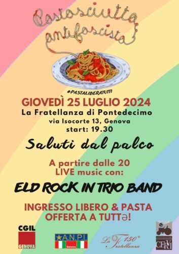 Giovedì 25 luglio 2024 a partire dalle ore 19,30 presso la Fratellanza di Pontedecimo in via Isocorte 13, Camera del Lavoro di Genova, Anpi Genova e La Fratellanza Pontedecimo organizzano la consueta edizione della “Pastasciutta antifascista”