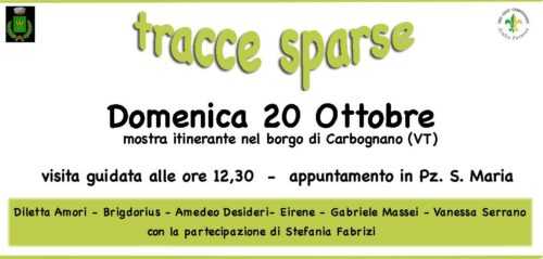 Tracce sparse a Carbognano è una mostra itinerante nel centro storico che si snoda in un percorso di opere d’arte realizzate da giovani artisti emergenti operanti nella zona del viterbese, in modo da coinvolgere la comunità locale nell’accoglienza e nel dialogo con l’arte e gli artisti.