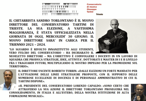 TRIESTE – Il chitarrista e didatta Sandro Torlontano è il nuovo Direttore del Conservatorio Giuseppe Tartini di Trieste: la sua elezione, con vastissima maggioranza di consenso al primo scrutinio, è stata ufficializzata nella mattinata di oggi, mercoledì 30 giugno. Il corpo votante era composto dai docenti in servizio nell’Anno Accademico 2020 – 2021. «Il Conservatorio Tartini di Trieste, eccellenza nel panorama musicale italiano – – ha dichiarato il neoeletto Direttore Sandro Torlontano – vanta un corpo docente di altissimo livello, composto da grandi musicisti dediti con passione all’insegnamento. Il mio intento e la mia idea operativa, con lo sguardo rivolto prima di ogni altra considerazione ai nostri Studenti, motore e fulcro della nostra Istituzione, sarà proprio quella di coinvolgere il maggior numero di Docenti nella formazione di una squadra che produca strategie, idee, e segua sotto la mia direzione progetti, attività attraverso un lavoro d’insieme, trasparente, critico e attento ad ascoltare i suggerimenti dei Dipartimenti, degli Studenti, del Collegio dei Professori, delle Segreterie.