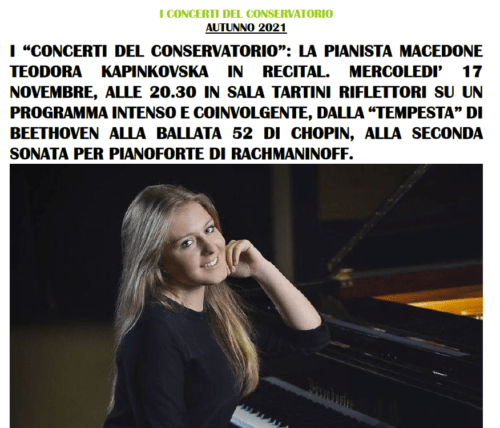 TRIESTE – Si preannuncia come un recital di grande suggestione, capace di rapire il pubblico attraverso scelte musicali di alto coinvolgimento, il concerto della pianista macedone Teodora Kapinkovska, in programma mercoledì 17 novembre alle 20.30 al Conservatorio Tartini di Trieste, in Sala Tartini, dove alternerà intense pagine di L.udwig van Beethoven, con la Sonata op. 31 n. 2 nota come “La tempesta”, e di Fryderyk Chopin, con la Ballata op. 52, per chiudere con la Sonata n. 2, op. 36 di Sergej Rachmaninoff.
