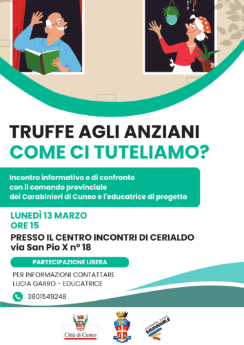 Gli incontri sono promossi dal Comune di Cuneo (settore socio educativo), all’interno del progetto “Prevenzione e contrasto delle truffe agli anziani” in collaborazione con il Comando provinciale dei Carabinieri di Cuneo e la cooperativa sociale Emmanuele. La sensibilizzazione ha lo scopo di fornire alcune indicazioni utili per tutelarsi al meglio di fronte alle truffe, attraverso differenti modalità.