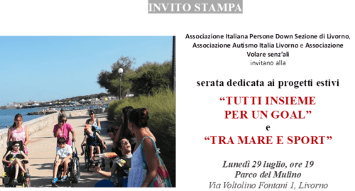 Lunedì 29 luglio alle 19, il Parco del Mulino ospiterà una serata dedicata ai progetti estivi Tutti insieme per un goal e Tra mare e sport, realizzati in rete da Associazione Italiana Persone Down Sezione di Livorno, da Associazione Autismo Italia Livorno e da Associazione Volare senz’ali e dedicati ai giovani con disabilità.