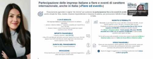 “La finanza agevolata – ha ribadito la dottoressa Ingrosso – è il tipo di intervento principe, poiché si è rivelato essere il più sostenibile e accessibile, sebbene in ottica “de minimis” per rispettare le norme della UE sugli aiuti di Stato, oltre al fatto di non entrare nella cosiddetta Centrale rischi. Il segmento fiere ed eventi è quello richiesto in misura maggiore, dal momento che rappresenta il biglietto d’ingresso della PMI candidata su aree regionali ancora non esplorate. Il momento espositivo è infatti ritenuto una vetrina privilegiata per avviare la commercializzazione operativa dei prodotti. L’importo massimo finanziabile può arrivare fino a 500.000 euro, e non può essere superiore a un quinto o un terzo, a seconda dei casi, dei ricavi medi dell’ultimo biennio, con un pre ammortamento di 24 mesi successivi, così da poter predisporre una vera e propria programmazione su più avvenimenti fieristici”.