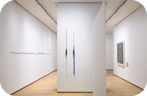 Le prime sono due versioni di Ruffiani (2025) di Marco Andrea Magni, in cui dei listelli di legno sembrano sfuggire alla definizione di cornice; insieme a loro, due Untitled (2019) di Alice Cattaneo, in cui quattro differenti elementi in vetro di Murano sono congiunti da una presa di cemento e inseriti in una piccola forma di ferro che li sorregge verticalmente. Dall’opacità, queste coppie di opere portano chi guarda verso un primo incontro con l’apertura: Untitled segnano linee di demarcazione verticale nello spazio, come se il materiale fosse in grado di aprire uno spiraglio di luce tra due dimensioni differenti; Ruffiani, invece, amplificano le trasformazioni di un perimetro dato favorendo un nuovo tipo di visione oltre il confine dell’immagine stessa.