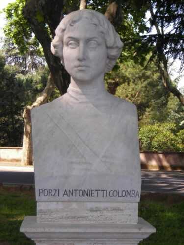 La mia attenzione fu catturata dal busto di una giovane donna il cui nome leggermente sbiadito nell’incisione riportava Porzi Colomba Antonietti, morta all’età di soli 22 anni a causa di una palla di cannone sparata dall’esercito francese mentre era impegnata nella difesa di Porta San Pancrazio sulle mura Aureliane a poche centinaia di metri da dove mi trovavo io in quel momento.