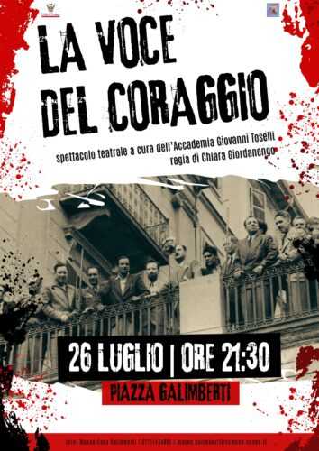 Il 26 luglio prossimo, per ricordare questo importante momento, il Comune di Cuneo propone, in piazza Galimberti, lo spettacolo teatrale “La voce del coraggio” a cura dell’Accademia teatrale Giovanni Toselli, con la regia di Chiara Giordanengo. Sentiamo sempre più importante ricordare in questi tempi incerti le parole di Duccio Galimberti. La voce dal terrazzo di una piccola città di provincia esorta a rompere la quieta indifferenza, le distratte abitudini quotidiane, l’accettazione fatalistica dei drammi e delle azioni più orrende.