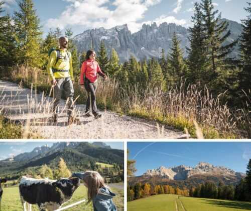 Più in quota è il bramito del cervo a risvegliare la sorpresa di un incontro, mentre funghi e vino novello condiscono le corroboranti merende del tardo pomeriggio, dopo le gite. Per ogni viaggiatore c’è un percorso giusto e la gente di qui sa come consigliare, ma anche come coccolare gli ospiti che scelgono le lusinghe del Catinaccio e del Latemar.