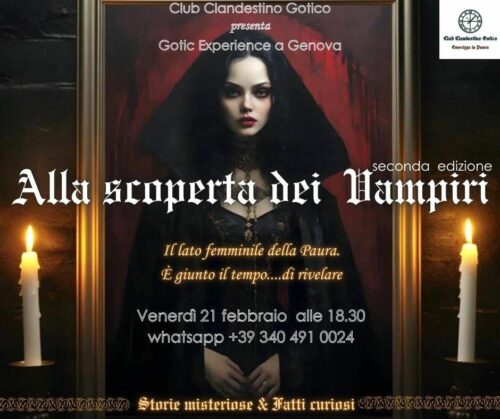 Genova – Venerdì 21 febbraio alle 18.30 presso la sede prestigiosa di Genova Dreams, il Club Clandestino Gotico è lieto di presentare il nuovo format ideato da Sophie Lamour “Alla scoperta dei Vampiri” con la seconda puntata “Il lato femminile dei Vampiri a lume di candela” la prima goticexperience° a Genova assolutamente da non perdere.