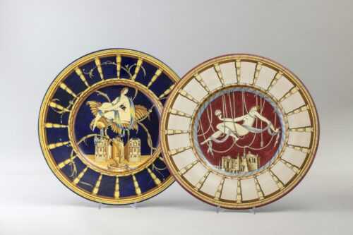 Naturalmente non può mancare in un’asta del Novecento Gio Ponti, il più grande architetto italiano, con due piatti della serie Le mie donne, capolavori eseguiti alla pittoria di Doccia a Sesto Fiorentino nel 1925 su suo disegno.