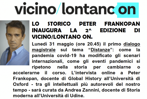Sette secoli più tardi, nel mondo globalizzato, la pandemia ha colpito pesantemente anche in altri settori: oltre alle vittime – più di 3 milioni di morti, ad oggi – il coronavirus ha accelerato processi e tendenze già in corso da decenni, aggravando divari sociali e disparità: nell’accesso al cibo, alle cure, ai diritti civili e democratici. “Distanze“, filo rosso del festival Vicino/lontano 2021 – in programma a Udine dal 1° al 4 luglio –, è anche lo spunto da cui partirà, lunedì 31 maggio alle 20.45 sul canale youtube e sulla pagina facebook di vicino/lontano, il dialogo che inaugura la seconda edizione della rassegna digitale Vicino/lontano ON. In collegamento dal Regno Unito, protagonista del primo appuntamento sarà proprio lo storico Peter Frankopan, docente di Global History all’Università di Oxford. Sarà impegnato in una conversazione condotta da Andrea Zannini, docente di Storia moderna e direttore del Dipartimento di Studi umanistici e del Patrimonio culturale all’Università di Udine, oltre che membro del direttivo dell’associazione vicino/lontano.