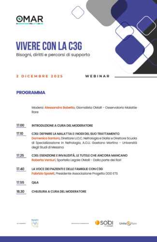 Al fine di far emergere i bisogni reali delle persone affette da C3G, valorizzare il ruolo delle famiglie e delle associazioni e offrire un’occasione concreta di approfondimento informativo sui percorsi di supporto disponibiliOMaR – Osservatorio Malattie Rare ha ritenuto opportuno organizzare, con il patrocinio di Progetto DDD ETS e con il contributo non condizionante di Sobi, il webinar ” Vivere con la C3G: bisogni, diritti e percorsi di supporto“.