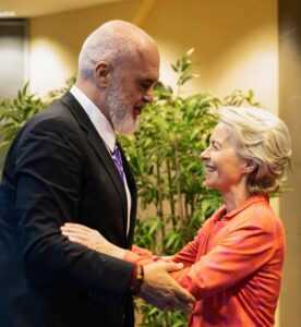 Il Primo Ministro on. Edi Rama, presente al vertice, ha condiviso sui social network istituzionali la foto di gruppo dei leaders balcanici e quella che lo ritrae personalmente con la stessa Presidente von der Leyen.