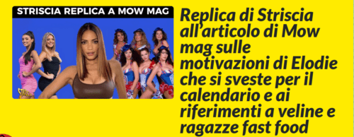 Milano – In occasione delle motivazioni espresse a mezzo stampa dalla cantante Elodie, circa il proprio lavoro nella nuova edizione del calendario “The Cal” Pirelli, il magazine MOW (mowmag.com) ha ricordato ai lettori alcuni degli emblematici episodi in cui il “corpo delle donne” è apparso rappresentato sui mass media in contesti differenti da quanto in realtà esprime oggi la società italiana. Tra le altre, anche: “le Veline” della nota trasmissione Striscia la Notizia, che è in onda quotidianamente su Canale 5.