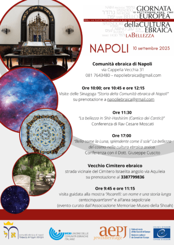 A Napoli la giornata si aprirà nella Sinagoga di via Cappella Vecchia 31, dove gli ospiti saranno accompagnati alla scoperta della cultura e delle tradizioni ebraiche con le visite guidate alla Sinagoga (alle 10.00 alle 10.45 e alle 12.15 ingresso libero su prenotazione a napoliebraica@gmail.com), recentemente risistemata con fondi della Regione Campania.